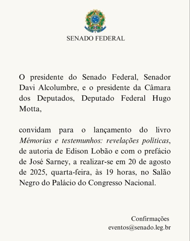 Um dos ícones da política brasileira, o ex-senador Edison Lobão lança na próxima quarta-feira (20), às 19h, no Salão Negro do Congresso Nacional, o livro Memórias e Testemunhos: Revelações Políticas. A obra promete revelar bastidores inéditos da política nacional, narrados por quem esteve presente em decisões que marcaram o país.