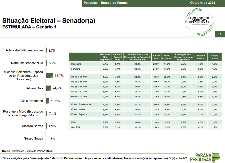 De acordo com o levantamento, Michelle Bolsonaro, que preside o PL Mulher Nacional, tem 35,7% das intenções de votos. Em segundo lugar aparece o ex-senador Álvaro Dias com 24,4%. A atual presidente do PT Nacional, deputada Gleisi Hoffmann, pontua com 16,2% e a esposa de Sérgio Moro e também deputada pelo Paraná, Rosângela Moro, foi citada por 7,4% dos entrevistados. O deputado Ricardo Barros, do PP, soma 4,9% e Sérgio Souza, 1,5%.