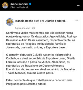 Pelas redes sociais, o governador do DF, Ibaneis Rocha, do MDB, anunciou, na noite desta quinta (15), os nomes de parlamentares que vão compor o seu secretariado. Ibaneis também revelou mudanças em algumas pastas.