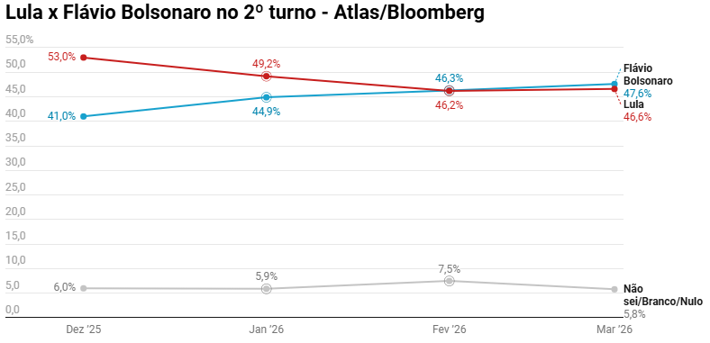 Na comparação com a pesquisa anterior da Atlas/Bloomberg, divulgada em fevereiro, Lula oscilou positivamente 0,4 ponto percentual, enquanto Flávio Bolsonaro cresceu 1,3 ponto percentual.