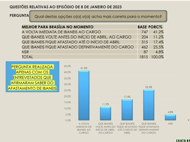 De acordo com a pesquisa, mais de 40% dos entrevistados querem que o emedebista reassuma o posto imediatamente. Outros 11,2% espera que Ibaneis volte ainda neste mês de março e outros 17,4% acreditam que o afastamento ocorrerá até início de abril.