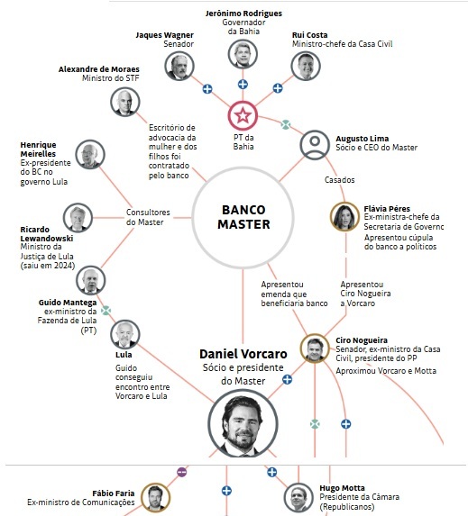 De acordo com os investigadores, o Banco Master mantinha articulações com nomes ligados ao presidente Luiz Inácio Lula da Silva. Entre os consultores da instituição aparecem: